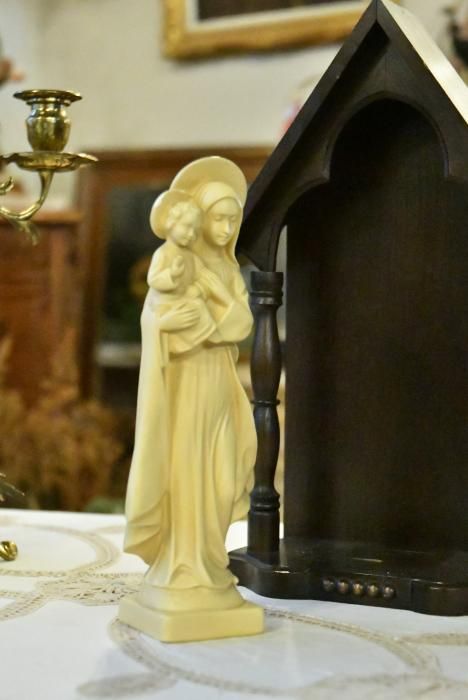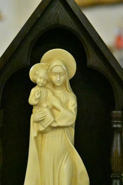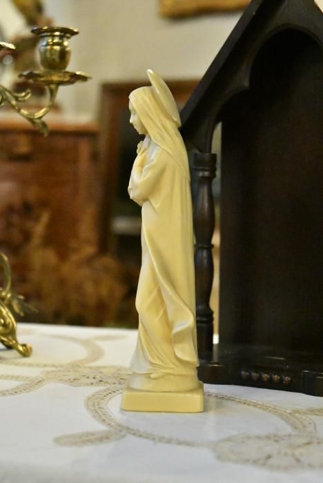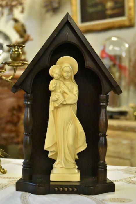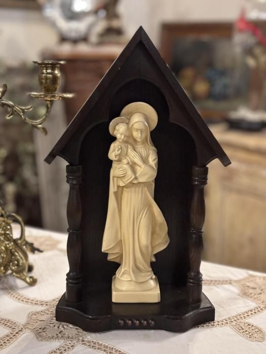木製の装飾もい美しい三角屋根の飾り棚付きで、マリア像をより美しく引き立てます。