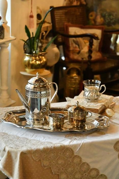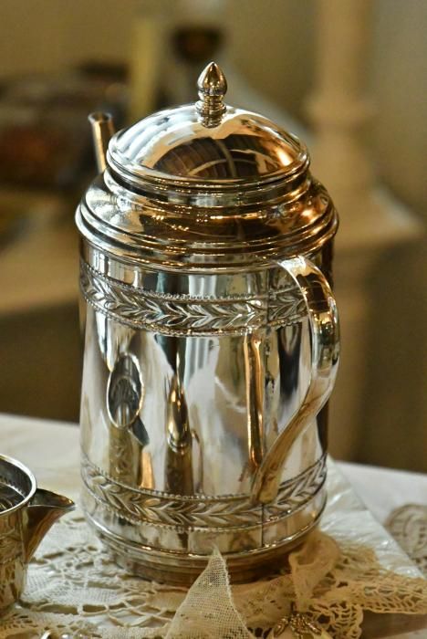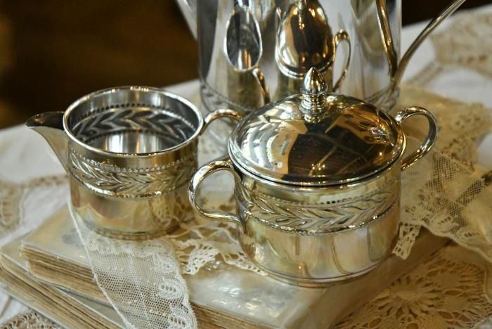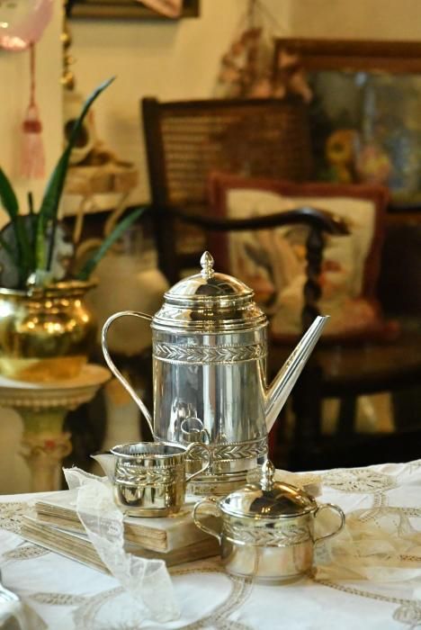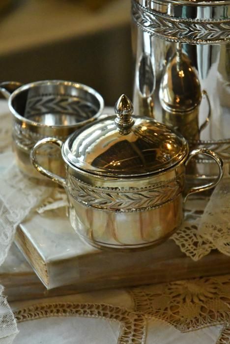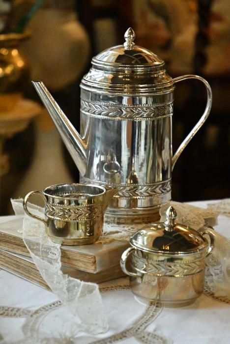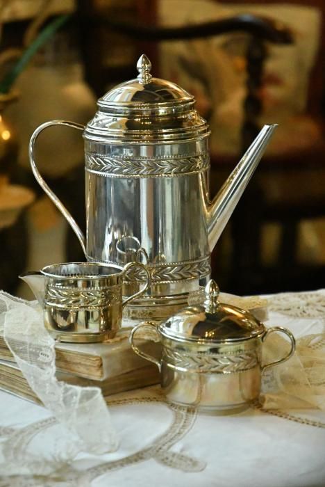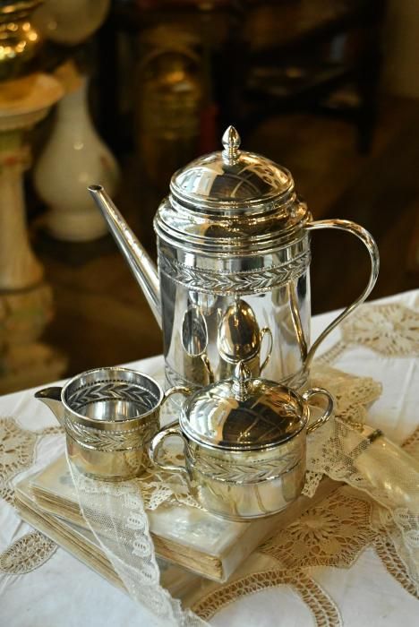 リーフ帯の可愛らしいティーポットとシュガーポットとミルクポットの